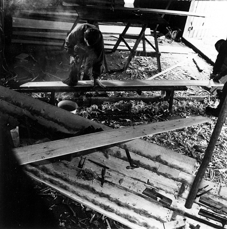 Neg nr 160. tredje omgångens förliga barbordsbräda fuktas med varmt vatten före insättningen. Foto 11.8 1962.