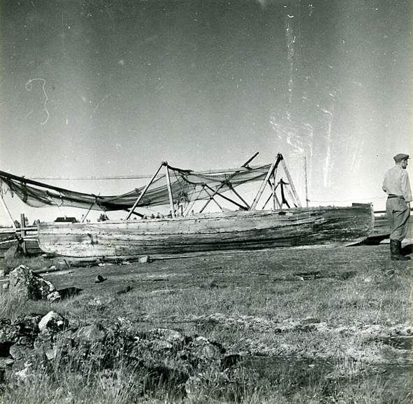 Sönderbråkad skötbåt med täljda vinningar, byggd före 1900.