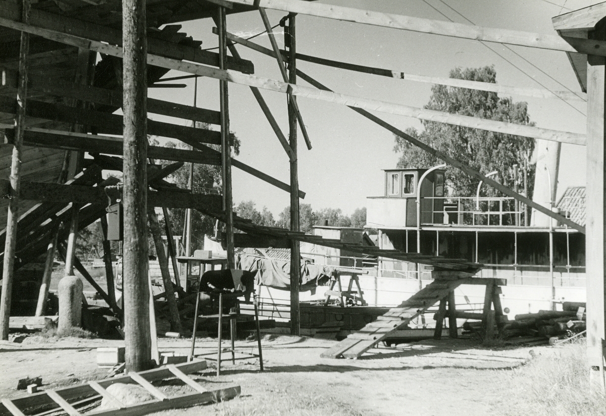 Interiör av varvsområdet med t.v. isländskt fiskefartyg under byggnad, i bakgrundens mitt fartyg i torrdockan.