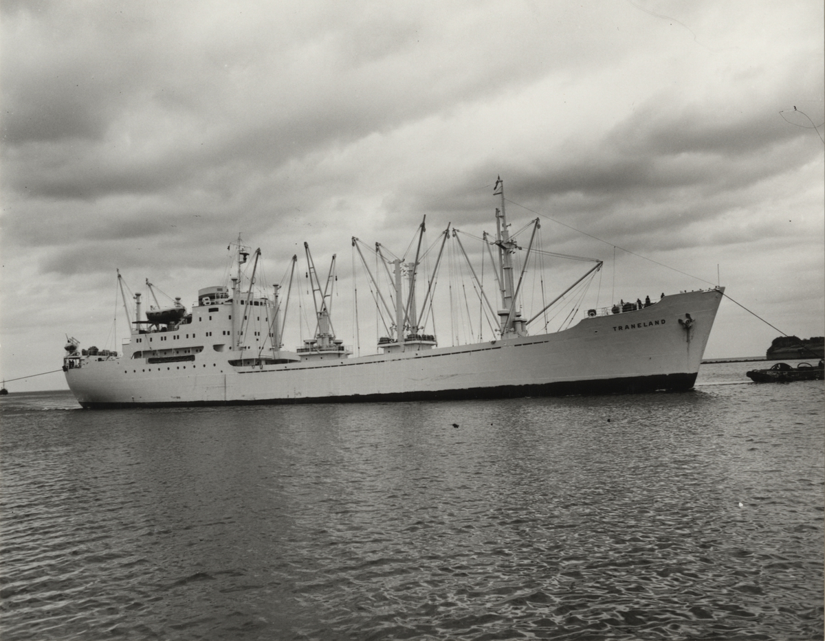 Foto i svartvitt visande lastmotorfartyget "TRANELAND" i Köpenhamn under år 1962.
