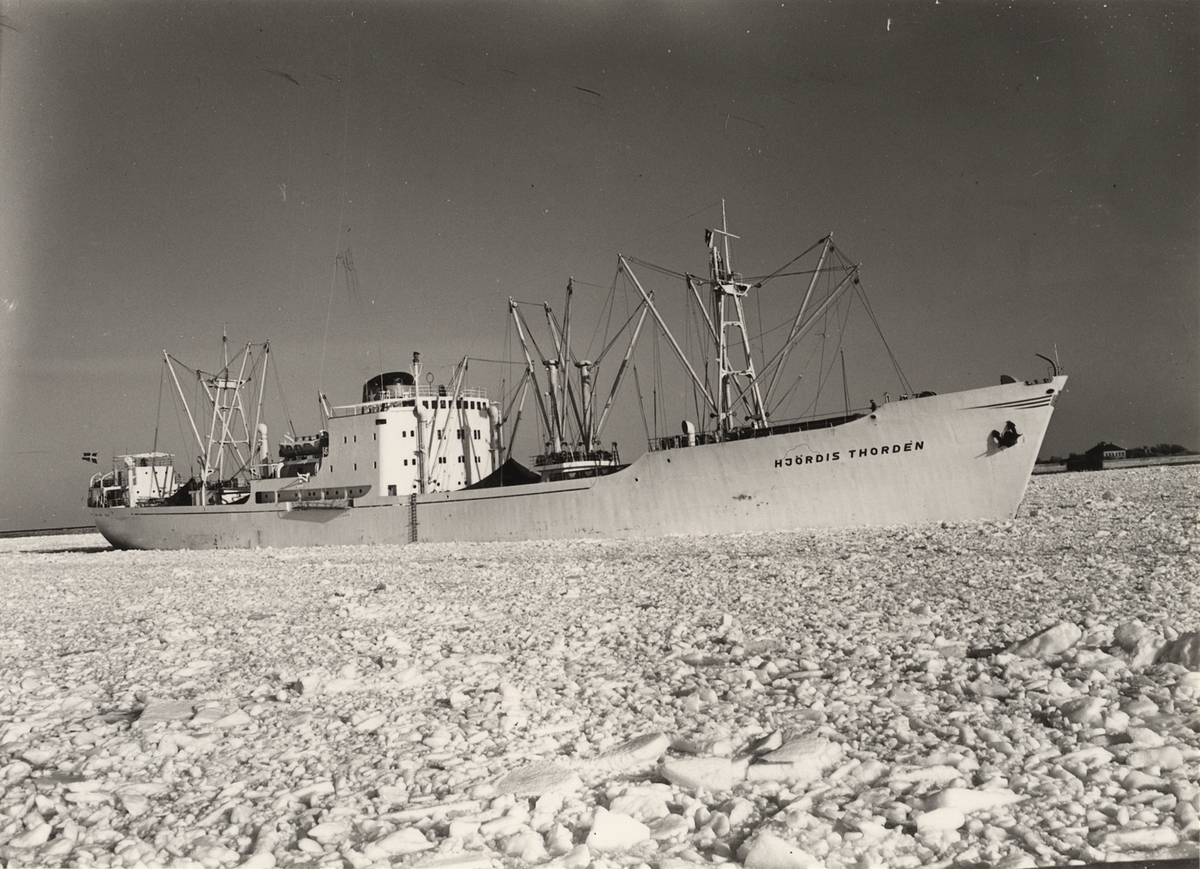 Foto i svartvitt visande lastmotorfartyget "HJÖRDIS THORDÉN" i Köpenhamn någon gång under åren 1955 - 1956.
