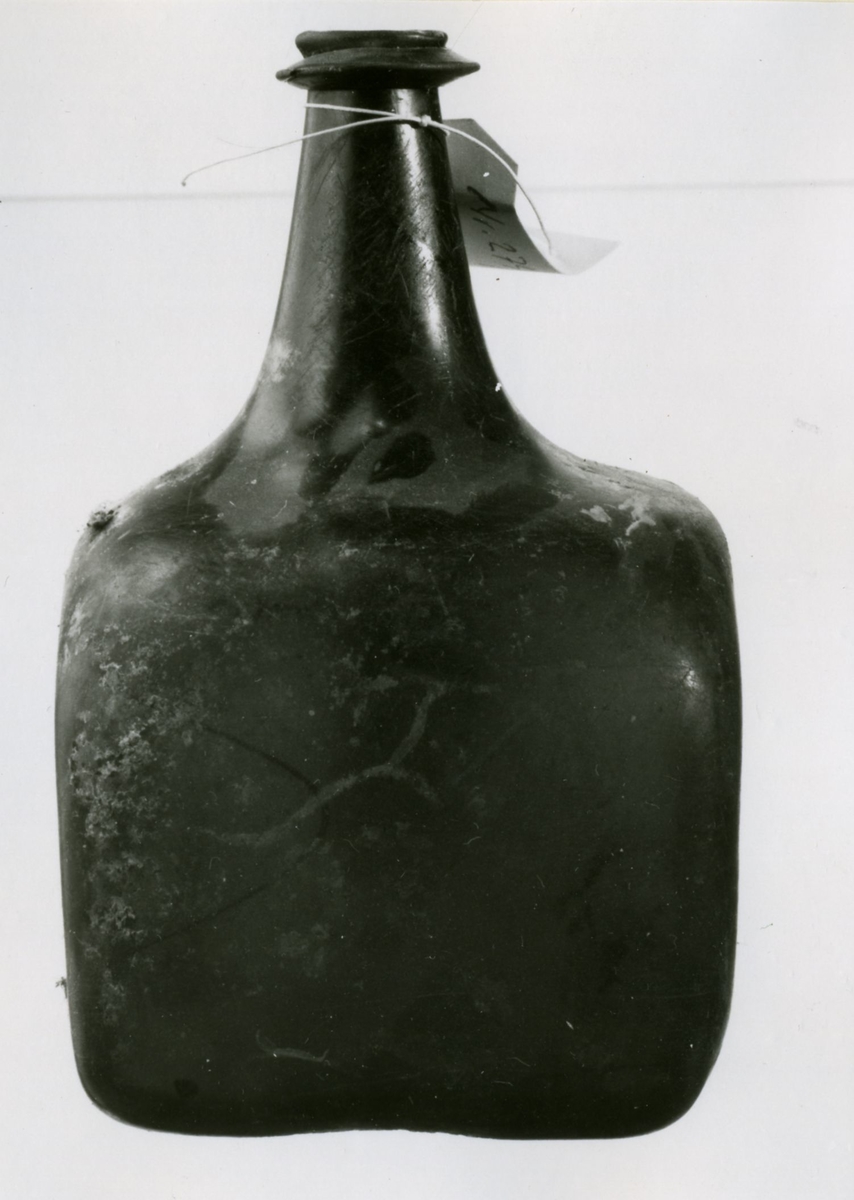Flaska av grönbrunt glas, fyrkantig botten, ring kring mynningen. Höjd 19 cm, mynning 2 cm, botten 10 cm, hälften avslaget. Sjöfynd från Djurhamn.