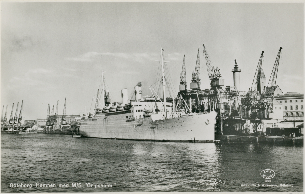 Vykort, föreställande Göteborgs hamn. Vid kaj M/S Gripsholm.