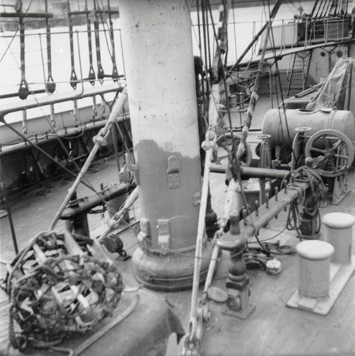 [från fotobeskrivningen:] "4-mast barken PASSAT av Mariehamn liggande i Sthlm. juli 1944. [sic] Foto av fördäcket med fockmasten." [---]