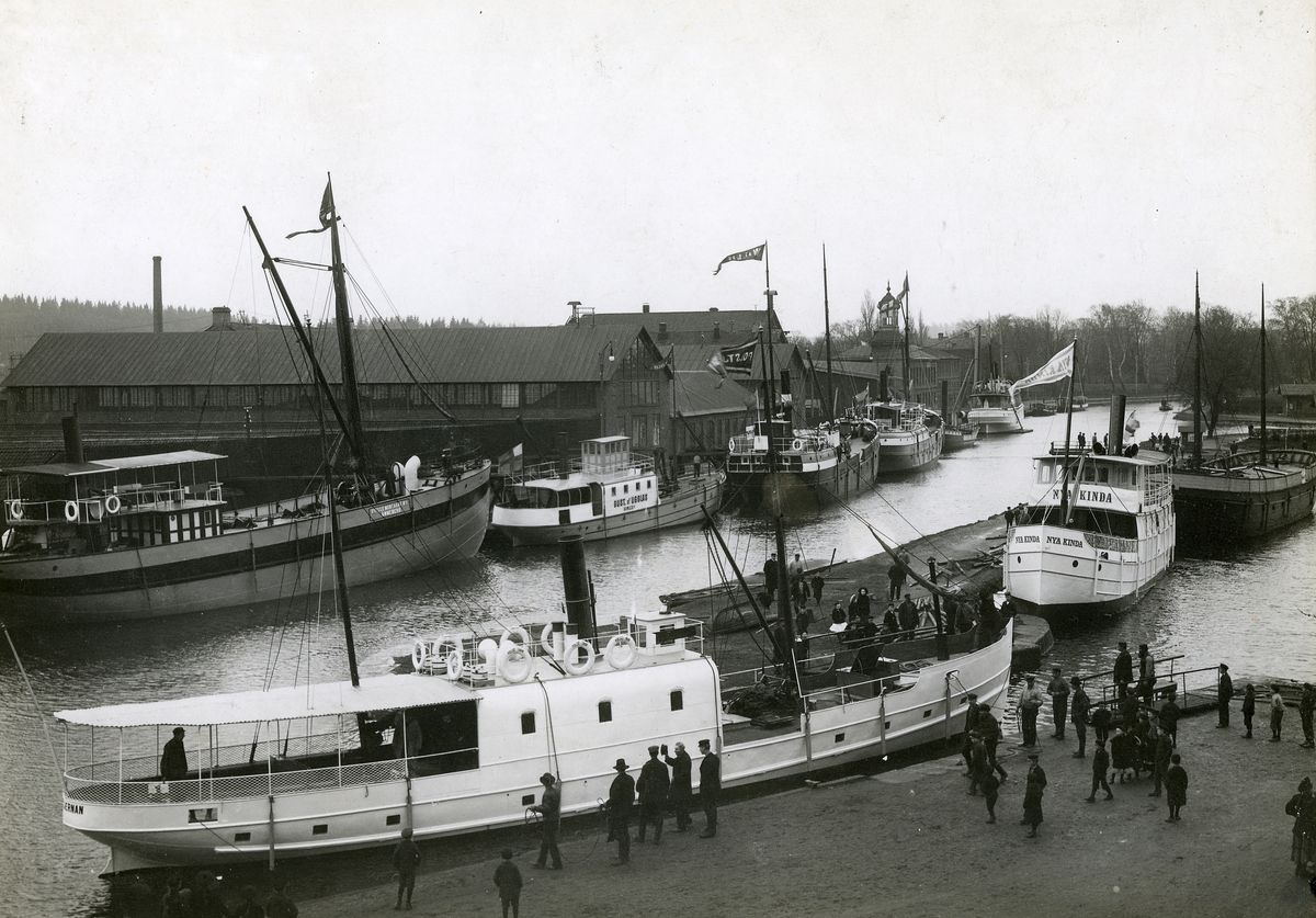 Närmast syns ångf Polstjerna, bakom stäven ligger ångf Nya Kinda. Flera namnkända fartyg på andra sidan Göta kanal.