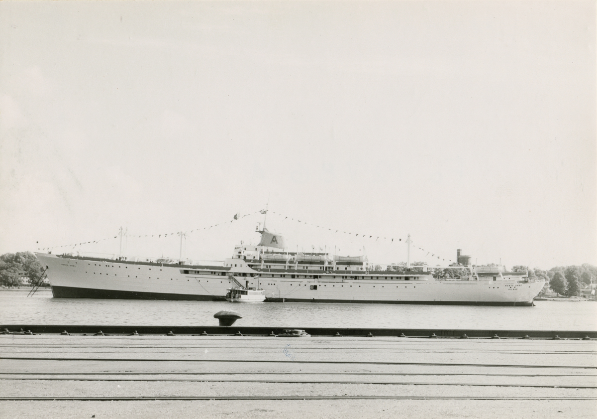 Krysningsfartyget Monte Umbe av Bilbao på Stockholms Ström i juli 1968