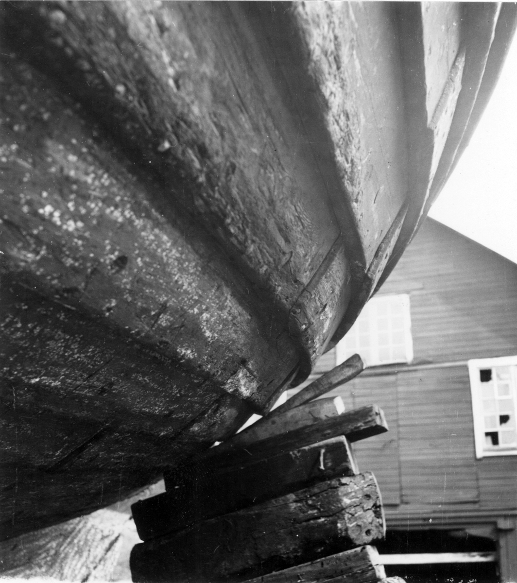 Uppland, Stockholms län, Frötuna skeppslag, Länna socken, Vettershaga. Vedjakten Adalia: Parti av bordläggningen i slaget. Foto i juni 1950.