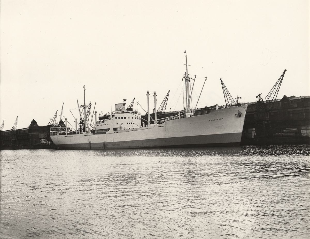 Titel: Foto i svartvitt visande lastmotorfartyget "KRAGEHOLM" i Köpenhamn under juli månad 1954.