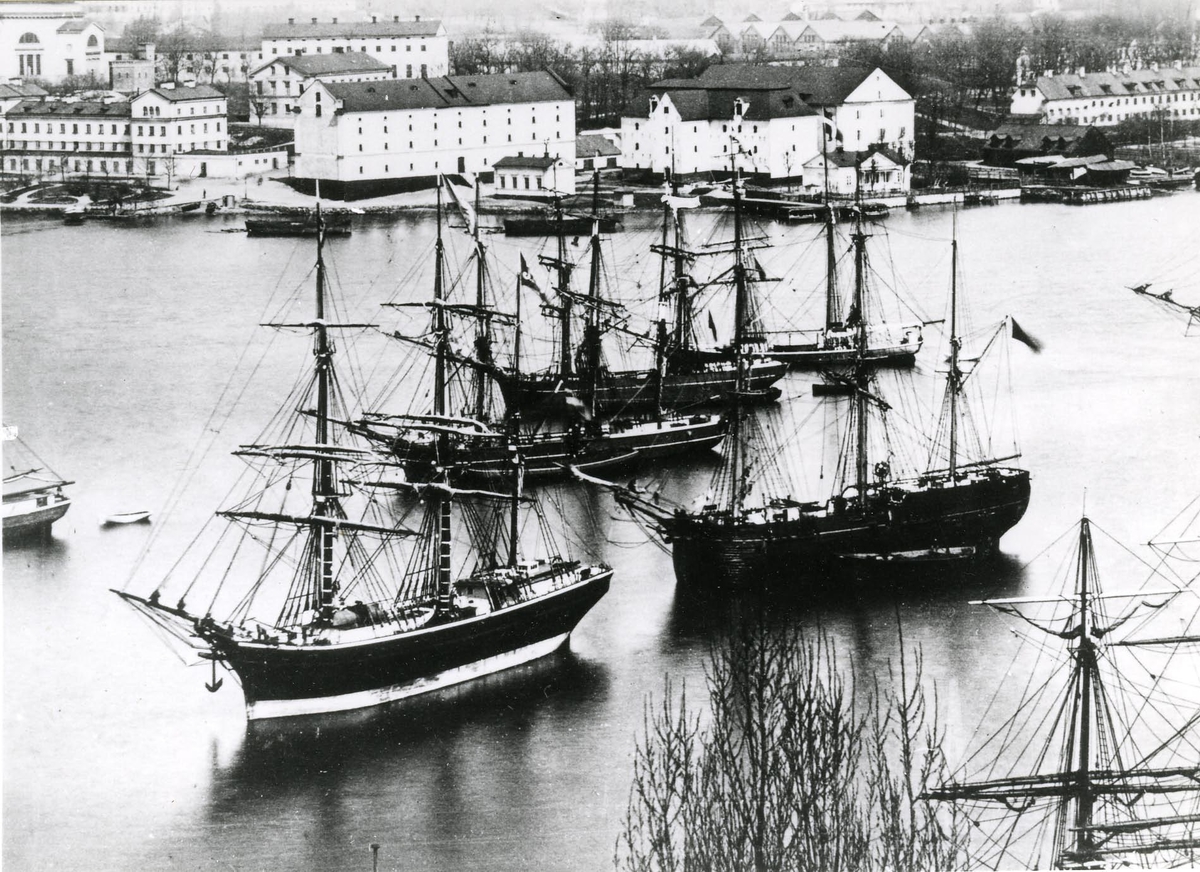 Foto av Stockholms ström med ankarliggare. I bakgrunden Skeppsholmen.