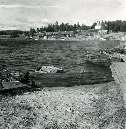 Fiskeläget med kapellet. I förgrunden på land forsbåt. Vid stranden eka, vid bryggan fiskebåt av äldre typ, byggd omkring 1912.