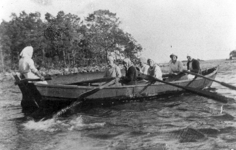 Småland, Kalmar län, Stranda härad, Döderhults socken, Runnö. Kvinnorna på väg till mjölkning i Sörgårdens nötöka. Foto av foto hos Ester Törnström, Runnö omkring 1916.