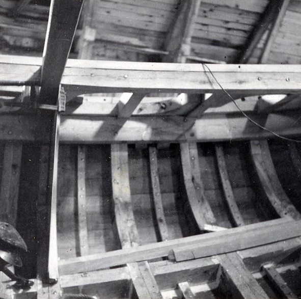 Lunds skeppsvarv.Lotsbåt under byggnad. Skrovinteriör med spantsystemet i akterskepp och sida.