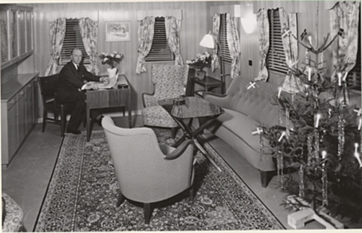 Skeppsredare E.K. Fernström sittande i redarehytten* ombord i sitt motortankfartyg A.K. FERNSTRÖM i dec. 1954