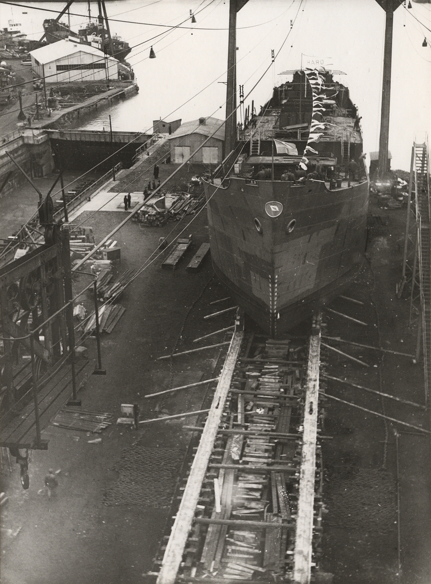 Sjöstättningen av lastångfartyget HARÖ vid Oskarshamns varv. Byggnr. 302.