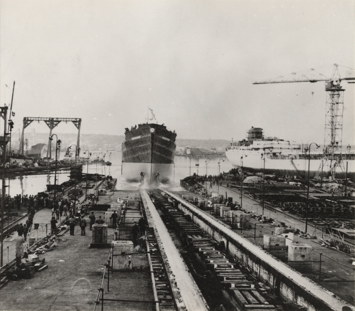 Lastmotorfartyget ARAGONA löper av stapeln i nov. 1955.