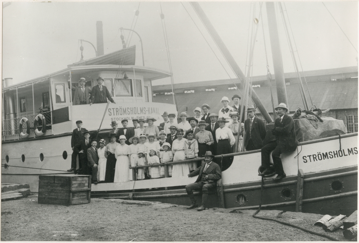 M/S Strömholms Kanal invid kaj med passagerarna uppställda på fördäck.