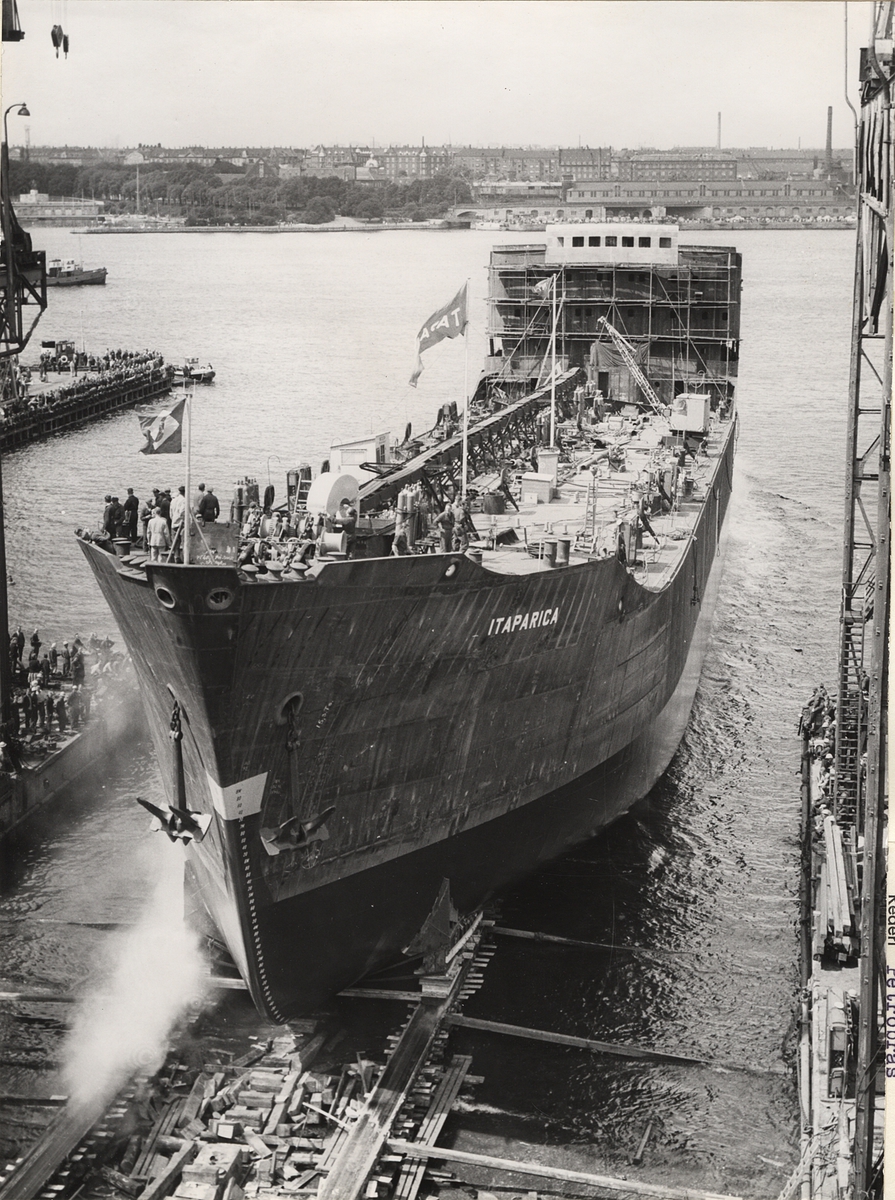 Det brasilianska tankmotorfartyget ITAPARICA av Rio de Janeiro går av stapeln vid B&W den 27 juli 1960.