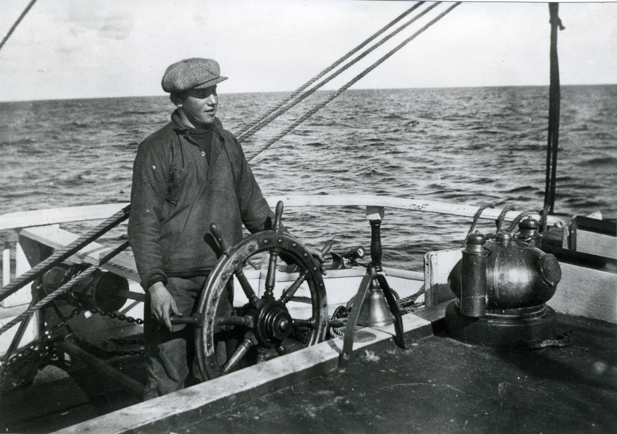 Lättmatros Alex Elfving vid rodret på HOPPET av Länna. Fotot är taget under en resa från Ursvikebn till Ålborg med sågade trävaror år 1930. Som lättmatros tjänade Elfving 45 kr/månad.