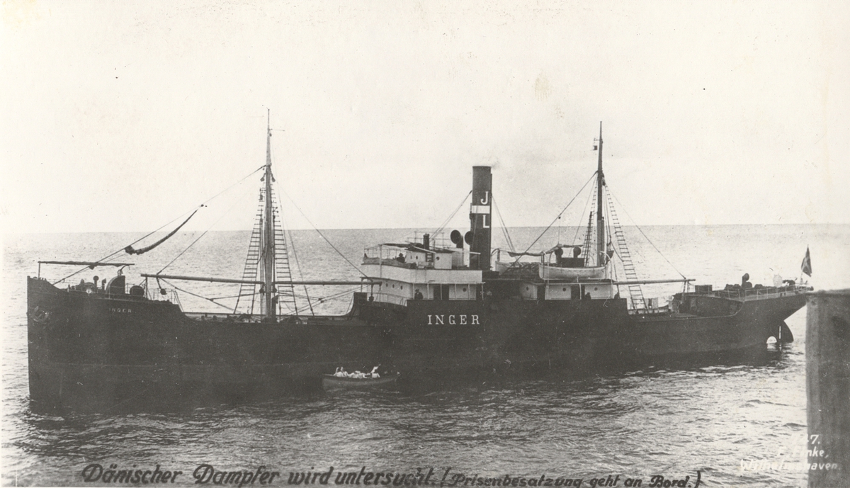 Vykort visande danska ångaren INGER som tvingats stoppa för att undersökas av tyskarna under första världskriget.