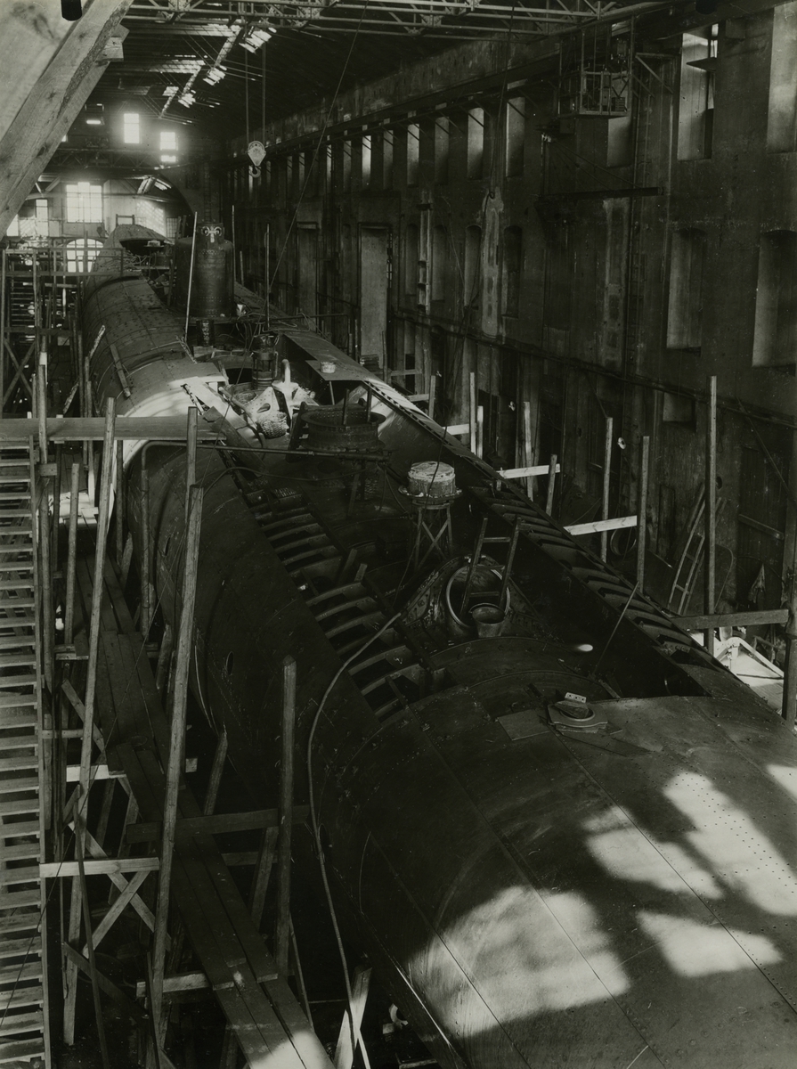 Under byggnad på Örlogsvarvet i Karlskrona. Skrovbyggnaden sedd upp- och akterifrån,