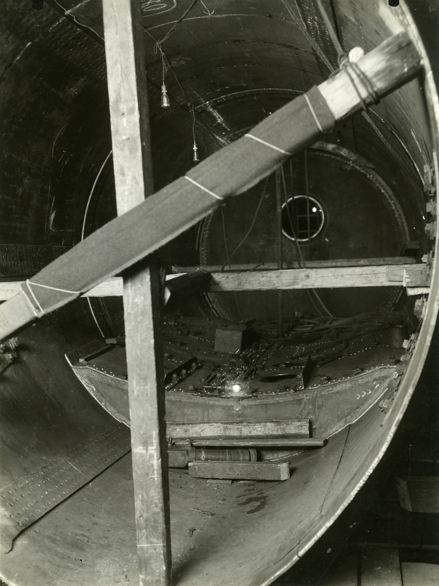 Under byggnad på Örlogsvarvet i Karlskrona. Torpedrummet förifrån. Förliga ändskottet ännu ej uppsatt, 1/5 1926.