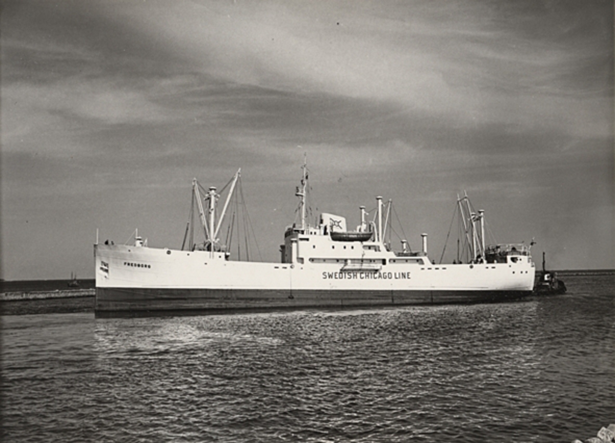 Foto i svartvitt visande lastmotorfartyget "FREDBORG" taget i Köpenhamn någon gång under 1950-talet.