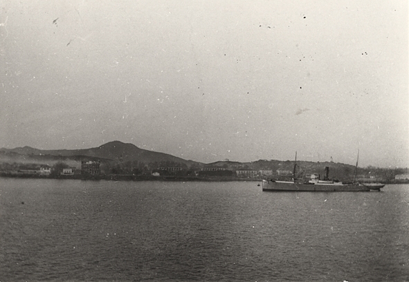 Hamnparti av Gjidjilli, Nordafrika. Korkplats. Lastångfartyget GERD av Stockholm.
