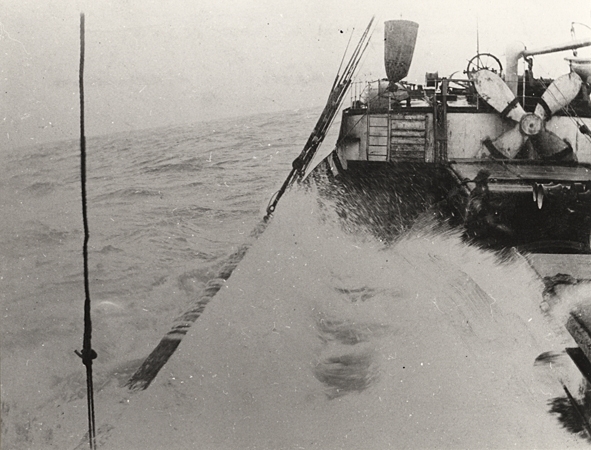 Lastångfartyget GERD av Stockholm under svår storm i Biscaya, 1914. Brottsjö över akterdäck.