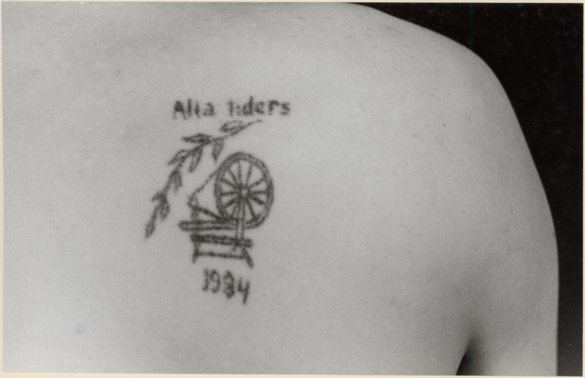 Tatuering på högra axeln. Utfördes i Gdynia 1934 i fyllan och villan och kostade ett par otvättade blåbyxor samt ett paket margarin, Schlagern "Än i dag gamla spinnrocken spinner" inspirerade till motivet.