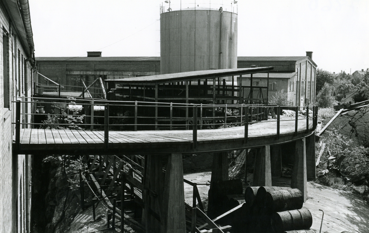 Oskarshamns varv. Plåtverkstad 14. i bakgrunden maskinverkstaden, oljetank, rörförråd, bro för inkörning till övervåningen, tunn-plåtverkstad 3-13.