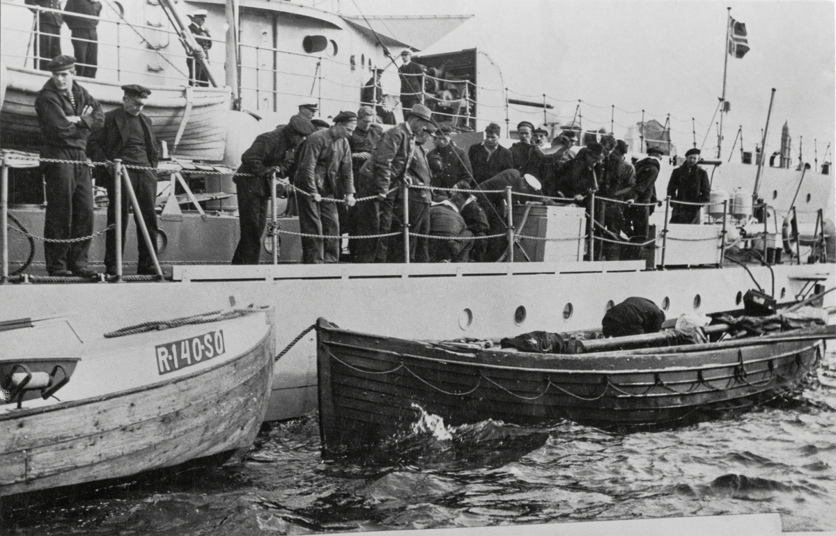 Besättningen från S/S Nyland som torpederades den 28 september 1939, har omhändertagits av en norsk jagare, som kom till undsättning.