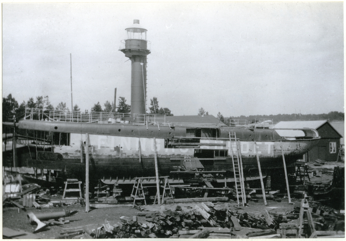 [från fotobeskrivningen:] "Rörhamns varv i Öregrund. FINNGRUNDETS fyrskepp förlänges."