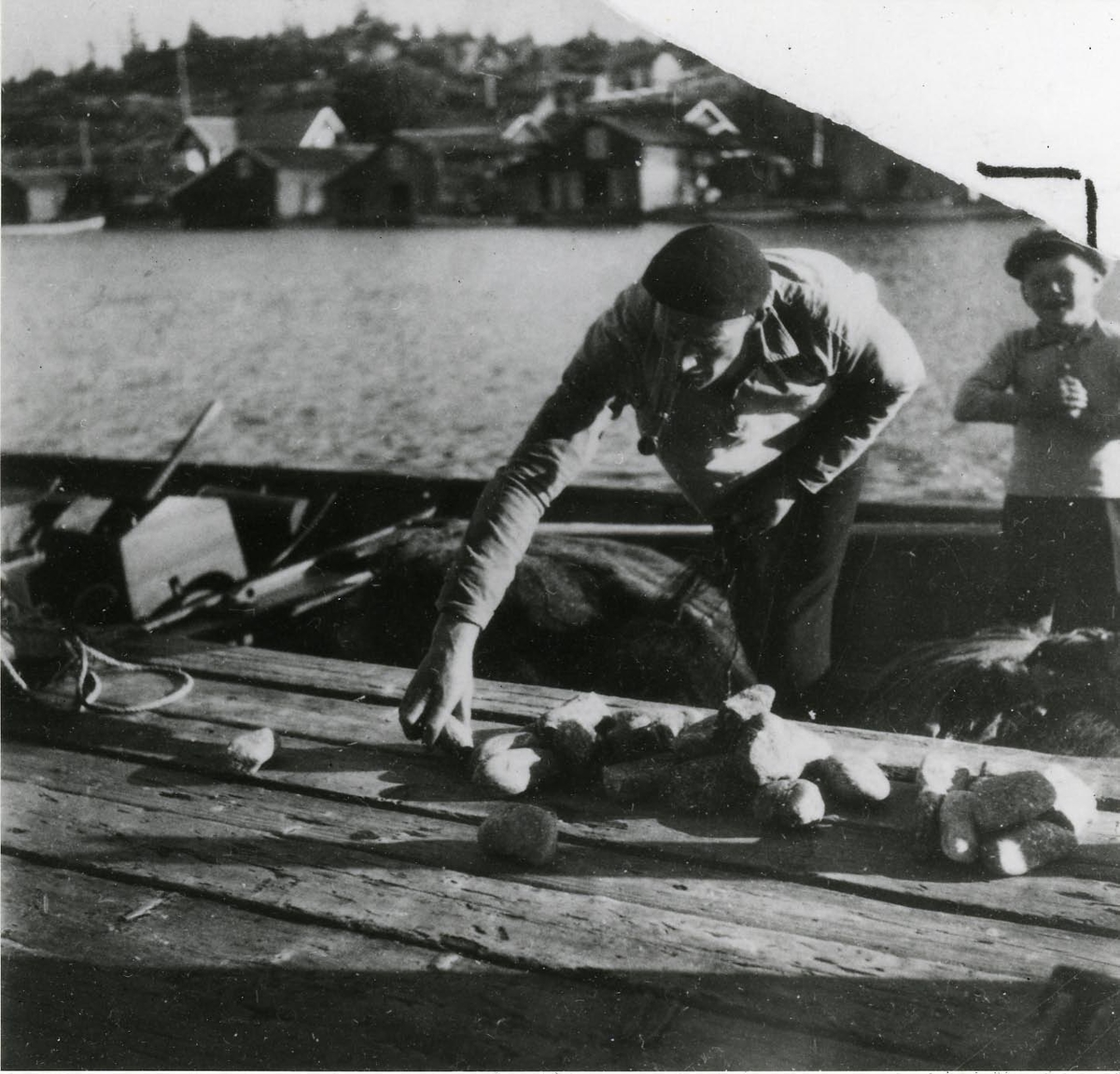 Ångermanland, Trysunda. Fiskaren Leonard Lundgren stenar (dvs. förser skötarna med stensänken) skötar före utfärden till fiskeplatsen.