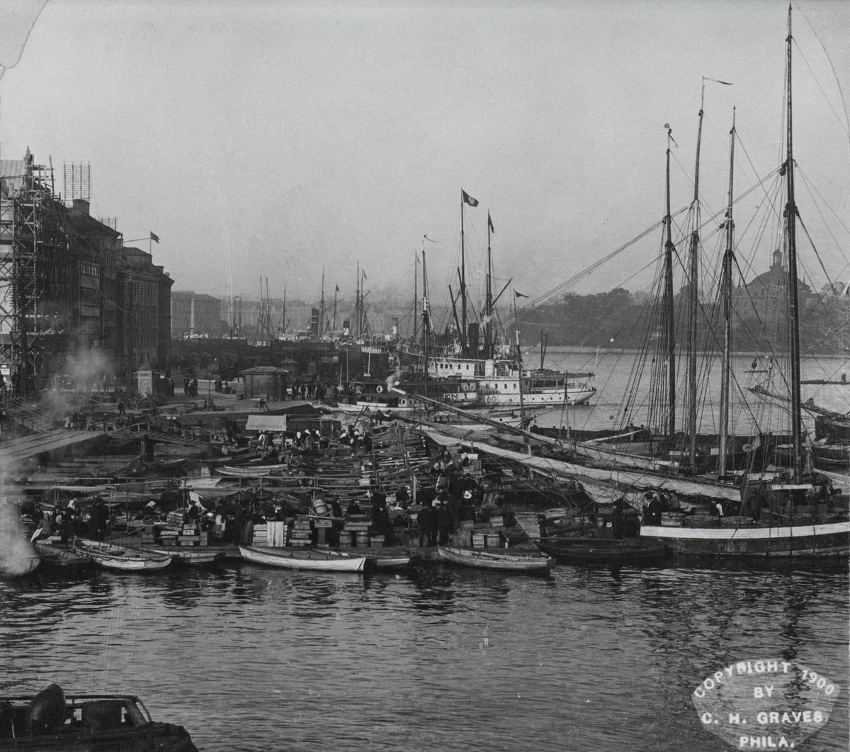 Hamnbild från Stockholm på slutet av 1890-talet. Slussen och fiskhamnen med bl.a. sumpbåtar.