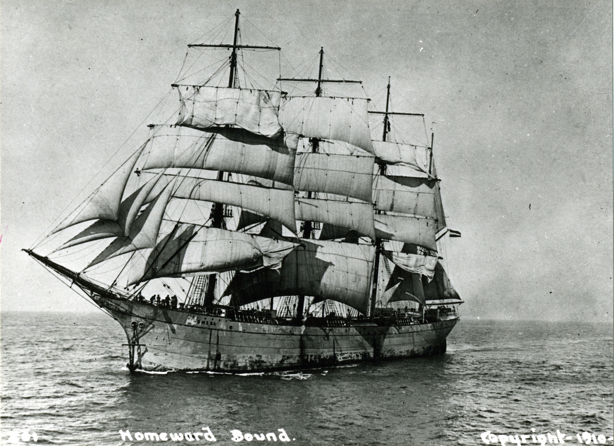 4-mast barkskepp Omega byggd som Drumcliff 1887 av Russel & Co, Greenock. Världens sista rena handelsfartyg under segel, sysselsatt i Guanotraden på Sydamerikas västkust tills hon sjönk 26.6. 1958 utanför Callao lastad med 3000 ton guano. Foto: Lee Passmore, San Diego 1910