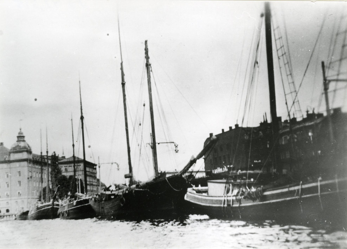 Estlandssvenska skutor liggande vid kaj i Stockholm.