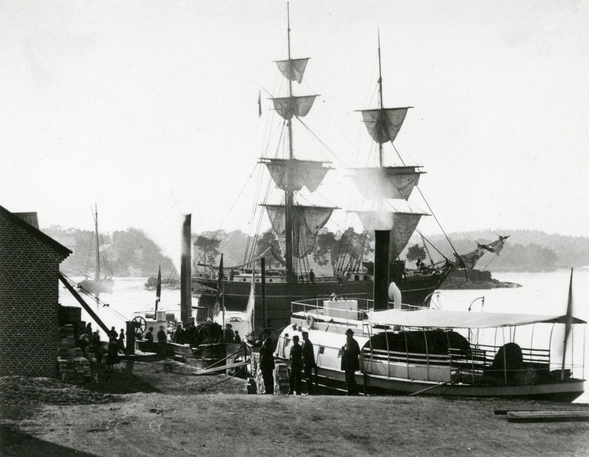 Gustavsbergs hamn år 1873. På fotot ses hjulångaren Wermdö (första båten i Gustavsbergsflottan), ångbåten Gustafsberg I samt en brigg av Figeholm.