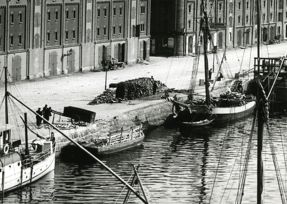 Foto från södra mot östra hamnpiren. Vedpråm och vedskuta, i fonden magasinsbyggnaderna. Fotot är en detalj av foto använt av J. Ekelund. Gefle stads hamn, Gävle, 1905, s. 74.
