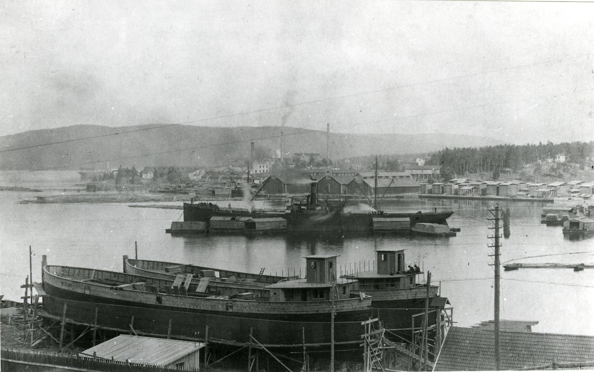 Lastande fartyg i Kramfors, 1920-tal? Bakon den av takpråmar omringade virkeslastade ångaren ses östra sågens tre hyvelmagasin. I förgrunden två av de tre ryska pråmar som Kramfors Bolag använde för att hämta kalksten från Gotland eller Kisaka från Rönnskär. Pråmarna kallades i folkmun för "bolsjevikerna" och ligger här upptagna för översyn.