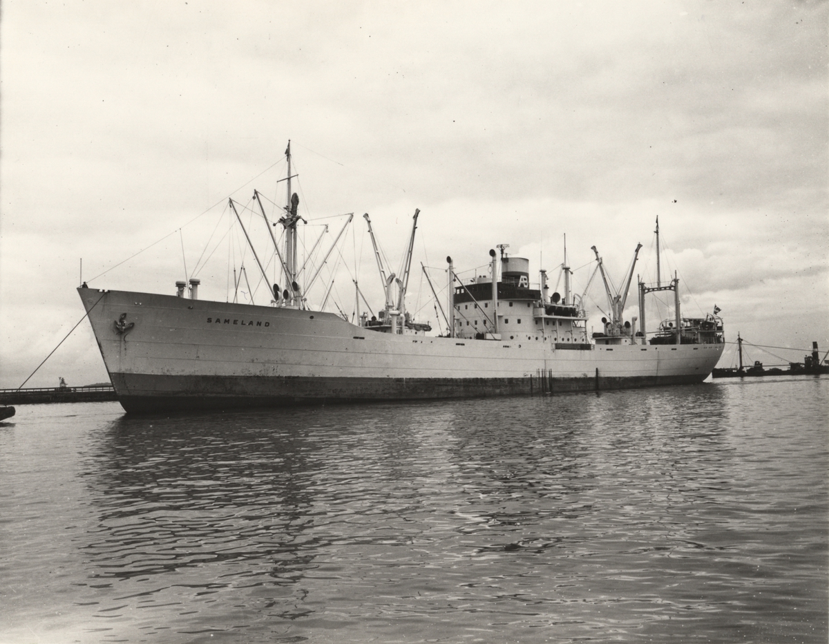 Foto i svartvitt visande lastmotorfartyget "SAMELAND" i Köpenhamn juli månad 1955.