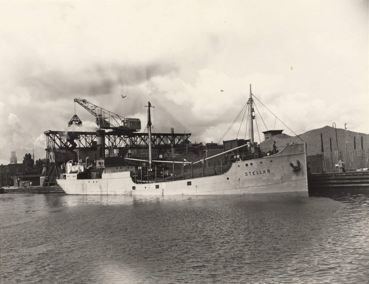 Foto i svartvitt visande lastångfartyget "STELLAR" med last av kol vid kaj i Köpenhamn den 28.8.1953.