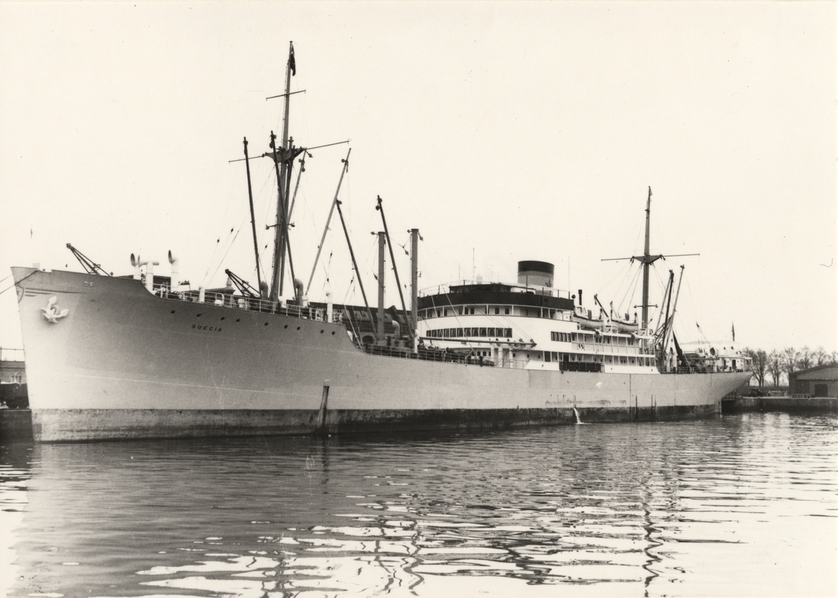 Foto i svartvitt visande lastmotorfartyget "SUECIA" i Köpenhamn.