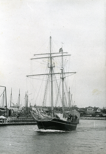 Holms skeppsvarv. Skonaren Wetsera, från Tyresö, (och) som blivit ombyggd till lustfartyg går ut på provtur 1961. Skåne, Malmöhus län, Råå.
