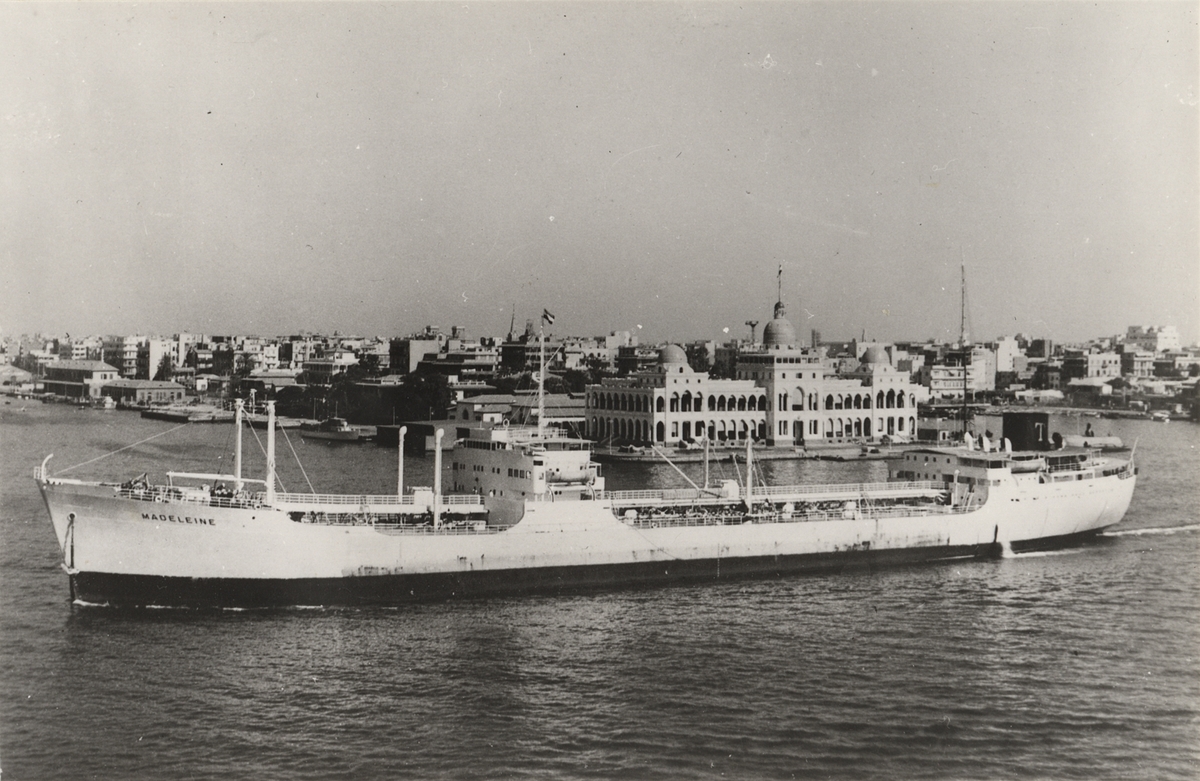 Foto i svartvitt visande tankmotorfartyget "MADELEINE" taget under 1950-talet.