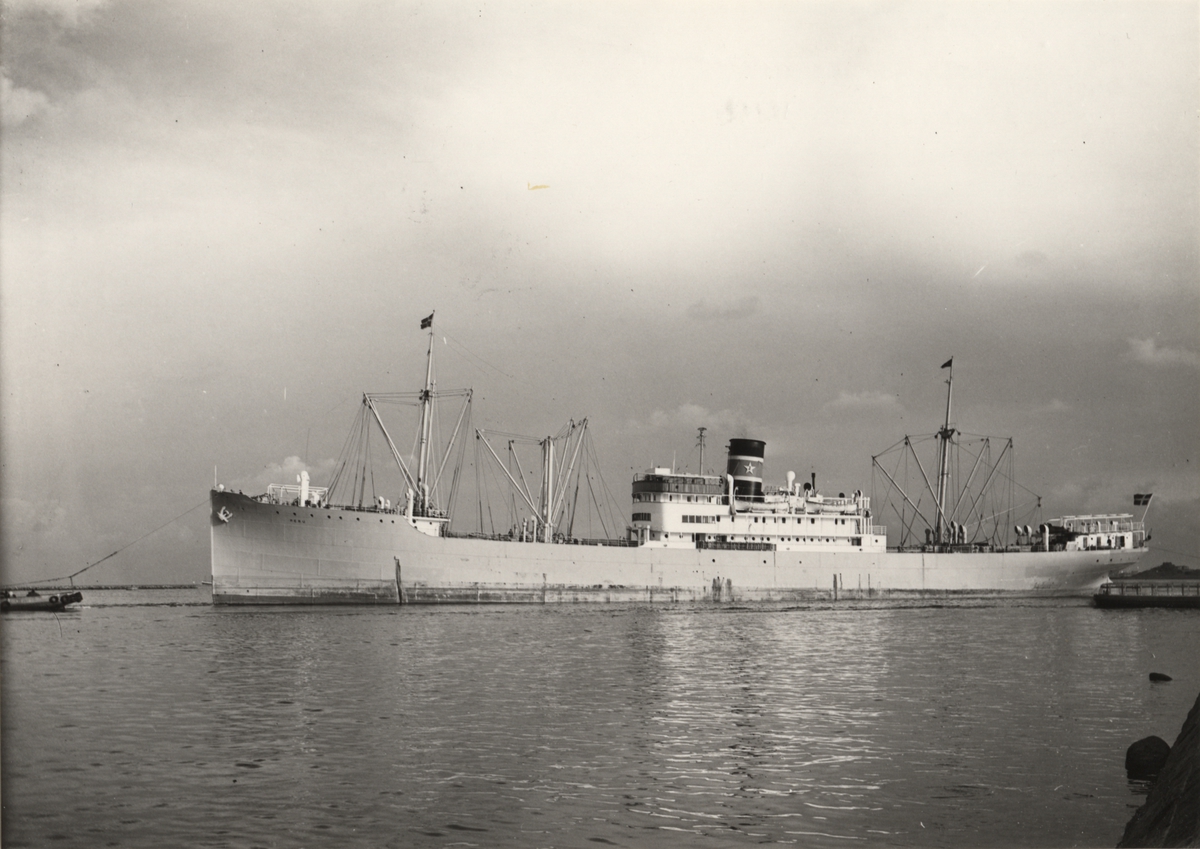 Titel: Foto i svartvitt visande lastmotorfartyget "PERU" taget i Köpenhamn år 1955.
