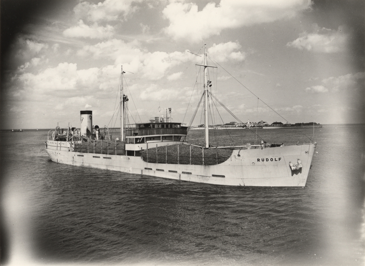 Foto i svartvitt visande lastångfartyget "RUDOLF" taget i Köpenhamn under år 1955.