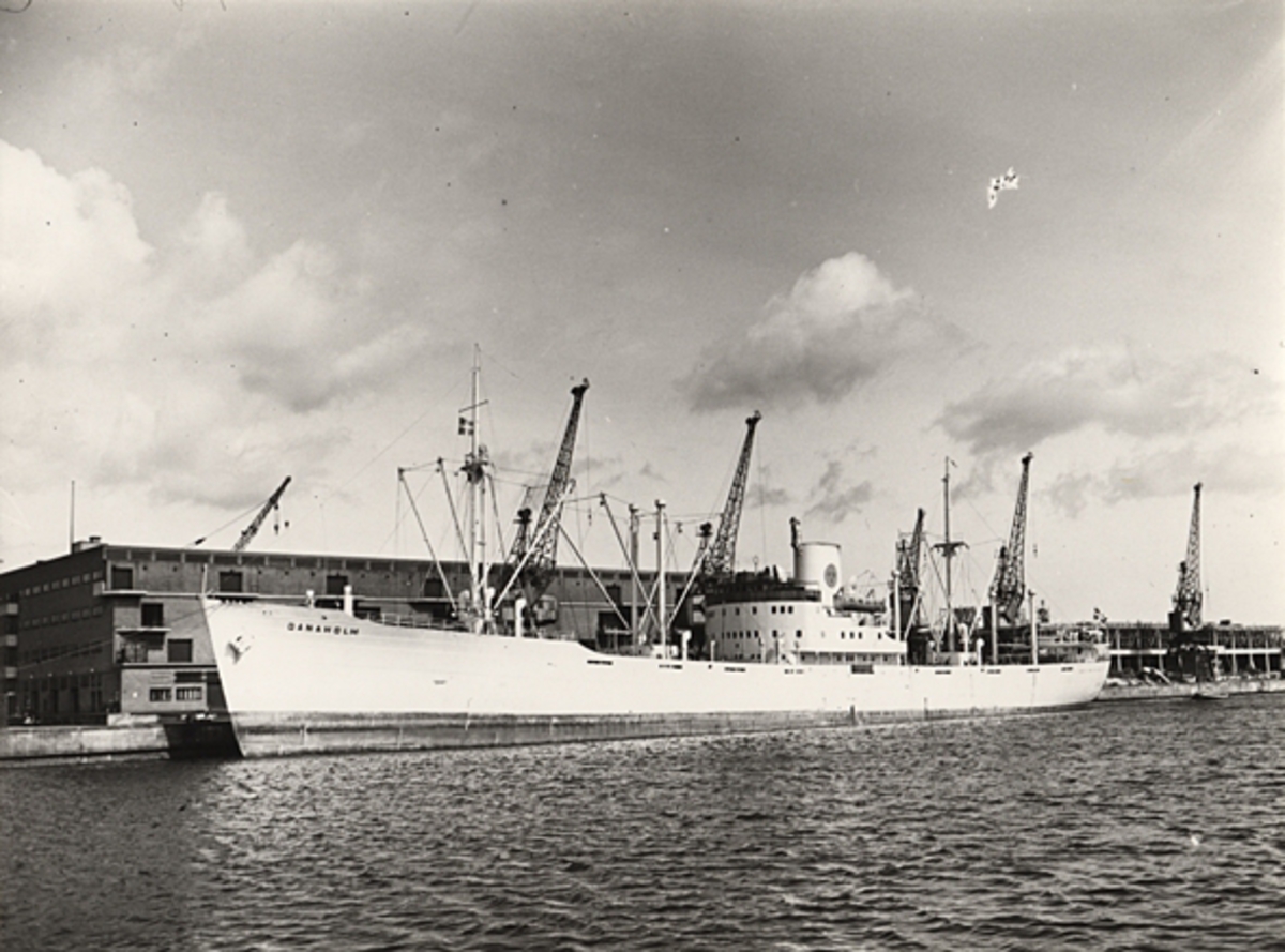 Foto i svartvitt visande lastmotorfartyget "DANAHOLM" taget i Köpenhamn den 2.4.1955.