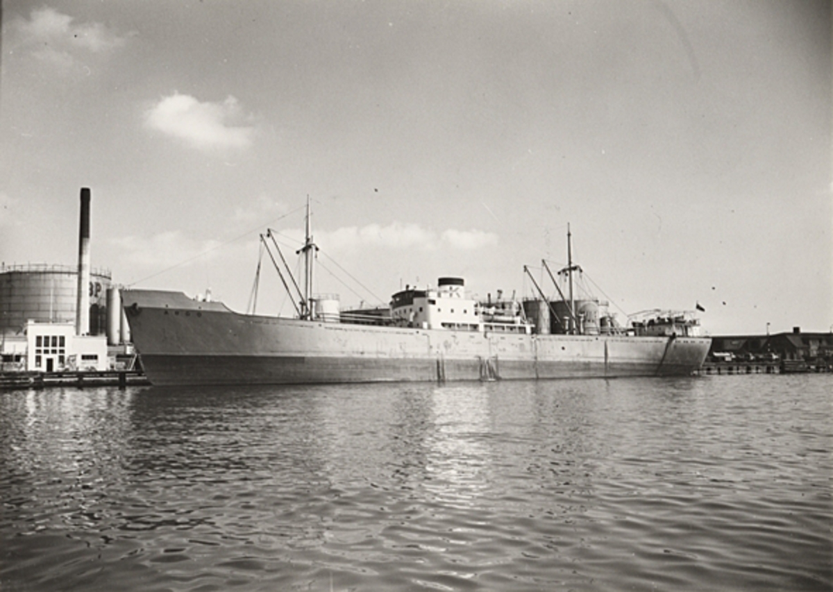 Foto i svartvitt visande lastmotorfartyget "ARGO" taget i Köpenhamn under år 1955.