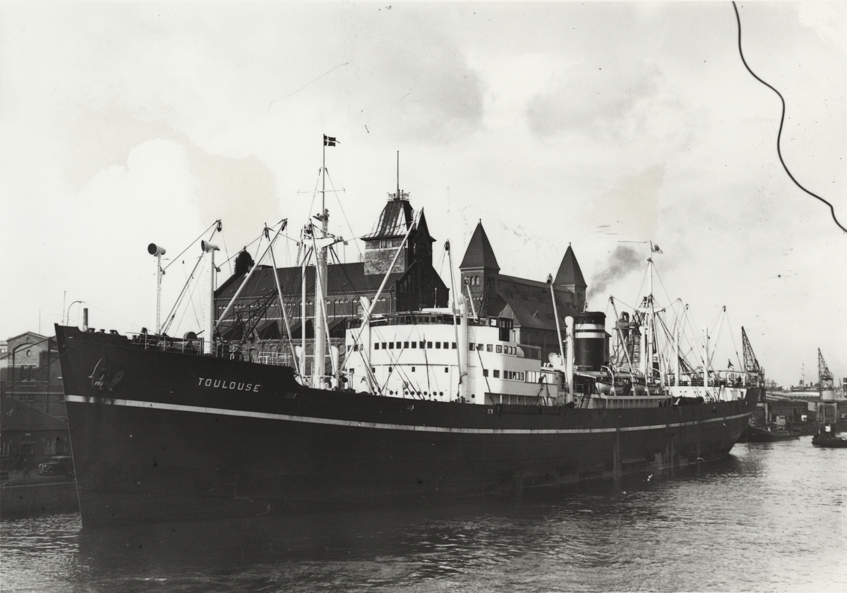 Foto i svartvitt visande lastmotorfartyget "TOULOUSE" i Köpenhamn.