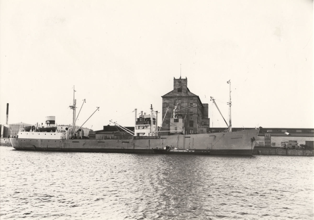 Foto i svartvitt visande lastmotorfartyget "SUNNANVIK" i Köpenhamn under 1950-talet.